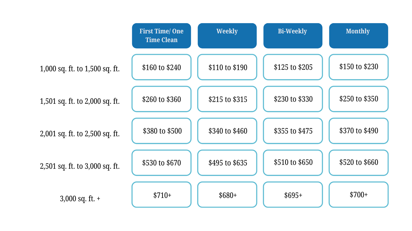 To ensure you get the most bang for your buck, every home receives a thorough clean following our detailed Maintenance Clean Checklist. Your first-time clean will be priced slightly higher to guarantee each room receives the proper care it needs. After your initial clean, choose from our weekly, bi-weekly, or monthly cleaning options to take advantage of our lower rates.